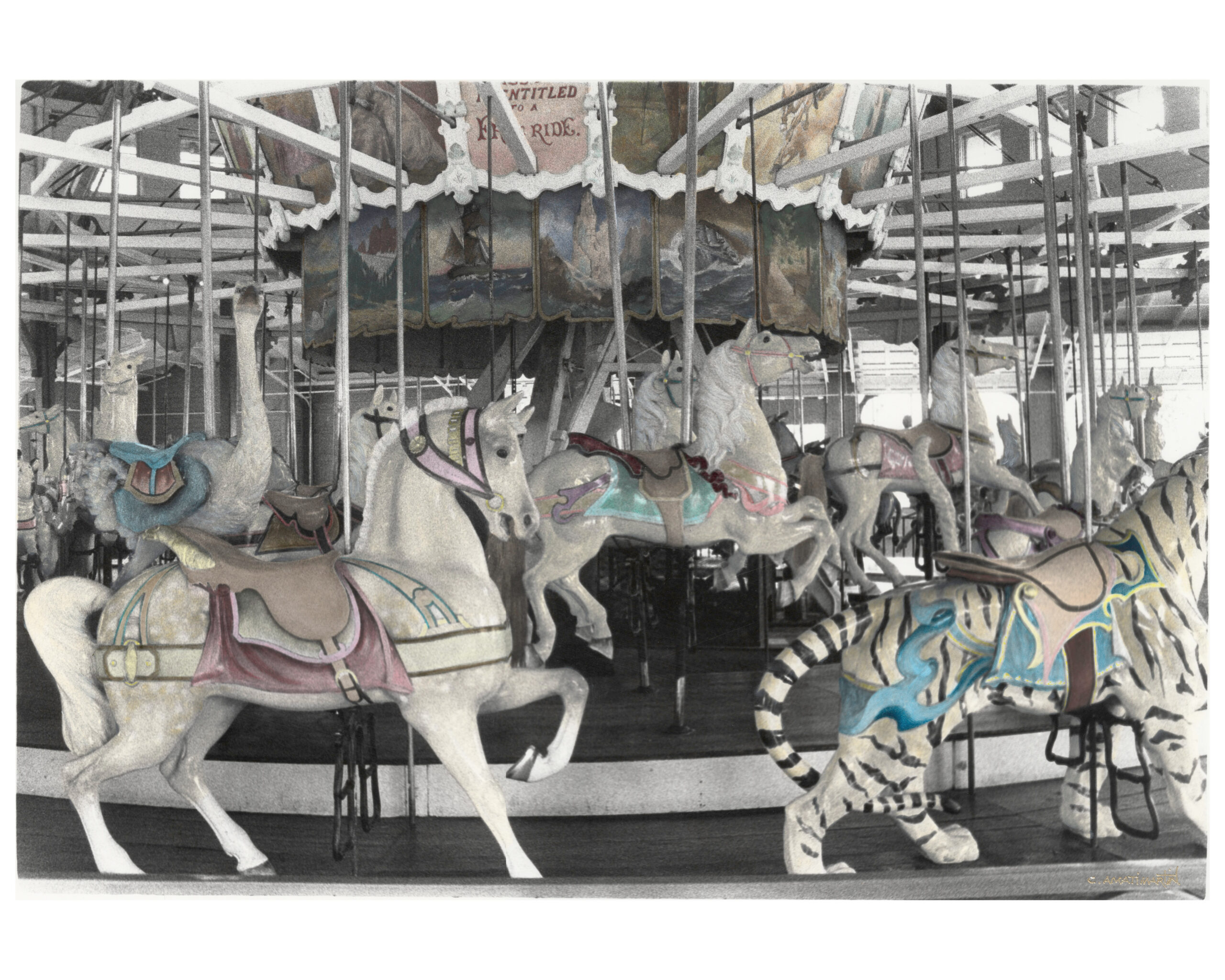 The images are original silver gelatin prints that have been individually hand colored by the artist Cheryl Amati Martin. The 15 Carrousel images constitute a unique series of works within Cheryl Amati Martin’s broader body of work known collectively as American Way Collection.